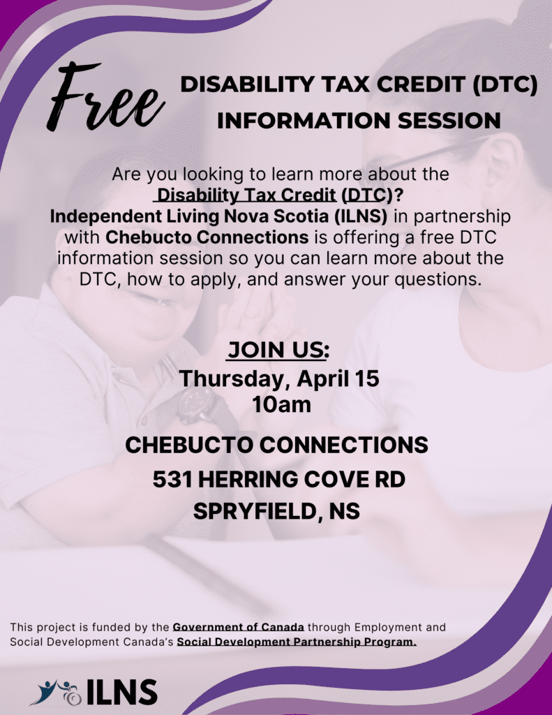 Are you interested in discovering more about the Disability Tax Credit (DTC)? Independent Living Nova Scotia (ILNS), in collaboration with Chebucto Connections, is hosting a complimentary DTC information session. Join us to learn about the DTC, the application process, and to have your questions answered.
