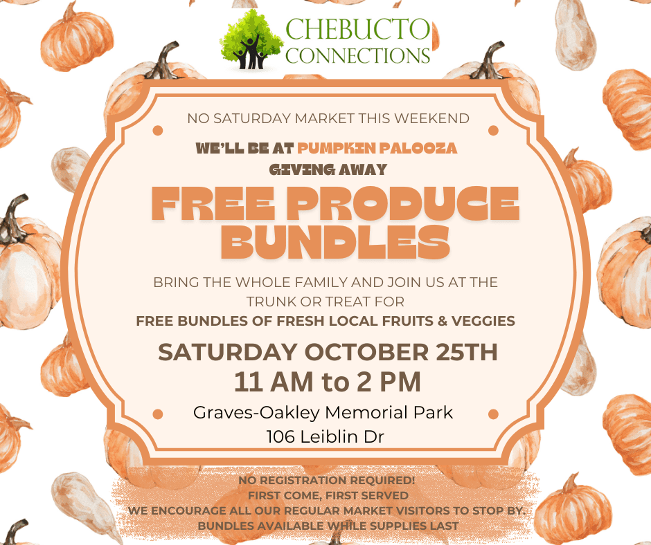 We will be at Pumpkin Palooza, offering free produce bundles.  Bring the family and participate in the trunk or treat for fresh, local fruits and vegetables.