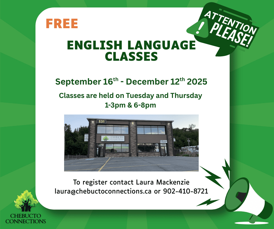 Free English Language (EAL) Classes will be held at Chebucto Connections located at 531 Herring Cove road. The dates are from September 16 to December 12th, 2025. Classes will be on Tuesdays and Thursdays from 1-3pm and 6-8pm.