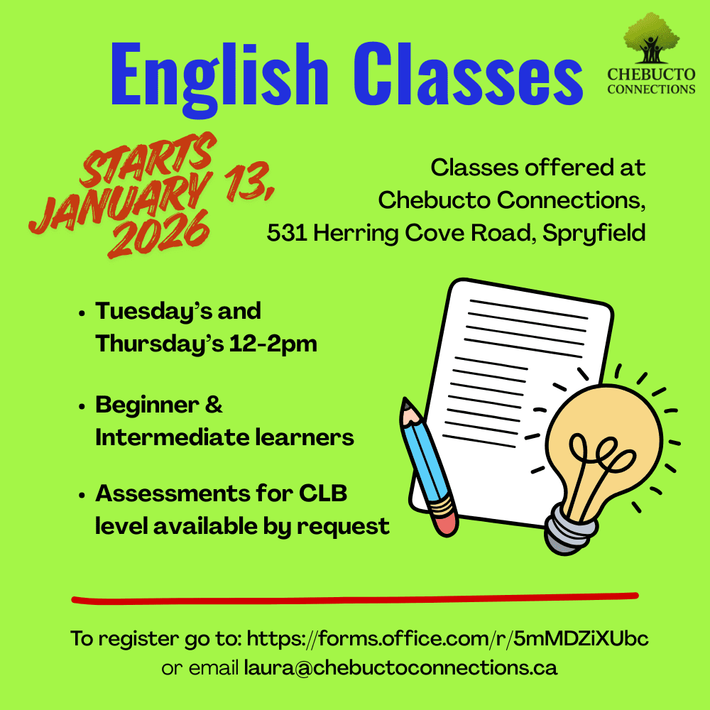 English classes starting January 13 2026, created to support non-English speaking people in Spryfield who want to grow their confidence with everyday language skills. These friendly sessions take place twice a week at Chebucto Connections and are open to both new and returning learners. Each class focuses on practical conversation, simple writing tasks, and real-life situations to help make learning comfortable and fun.