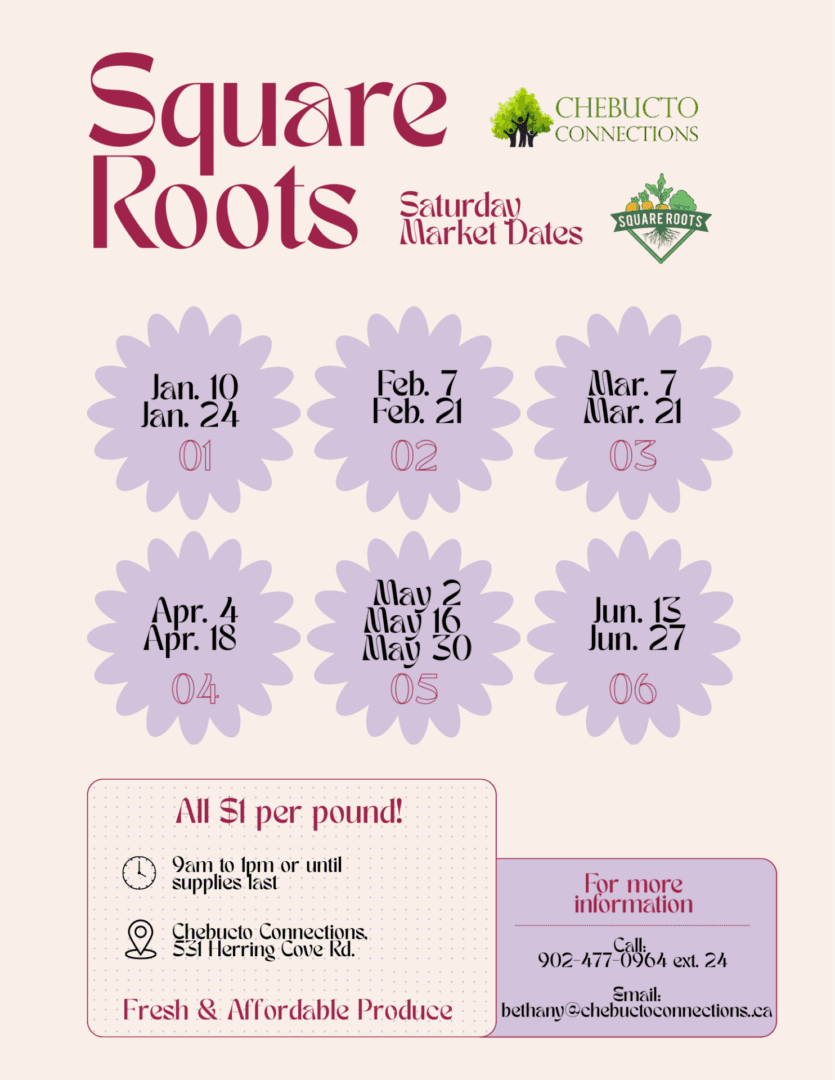 Our goal it to help folks eat healthier without breaking the bank. Visit our community calendar, call 902-477-0964 ext. 24 or email bethany@chebuctoconnections.ca for upcoming market dates.